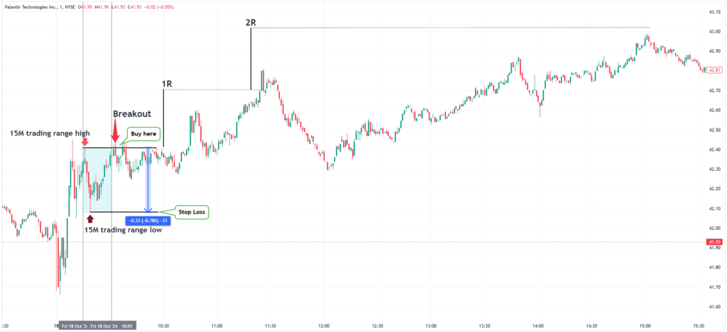 The 15-minute trading range should stand out clearly compared to previous price action. We enter when the price breaks out of this trading range. Price breakouts occur when a stock moves decisively above resistance (high of the 15-minute range) or below support (low of the 15-minute range) levels with increased volume.