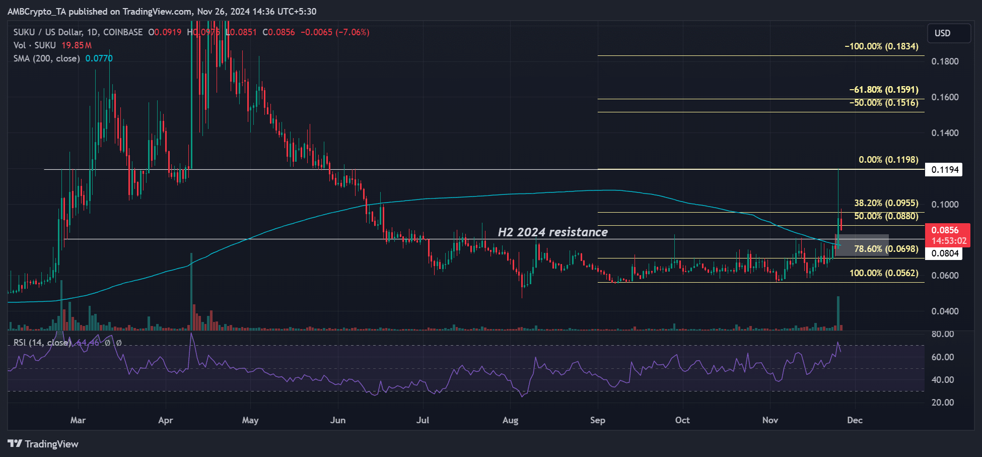 Additionally, the 200-day SMA aligned with the H2 2024 resistance level, which could reinforce bulls’ leverage if defended as a support. If so, SUKU could re-target the recent highs of $0.119.
