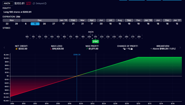 Here is an example of a covered call. Amazon (AMZN) is trading at $202.61 on November 15, 2024.