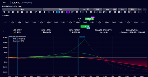 The example below is a diagonal spread using call options on RUT, the Russell 2000 index.