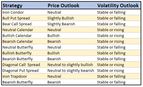 The table below provides a quick reference guide to help match your expectations for price movement and volatility with the most appropriate options strategy.
