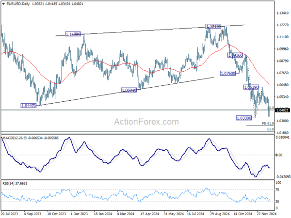 Intraday bias in EUR/USD remains on the downside for the moment. Firm break of 1.0330 support will resume the fall from 1.1213 and target 61.8% projection of 1.0936 to 10330 from 1.0629 at 1.0254, and then 100% projection at 1.0023. On the upside, above 1.0452 will turn intraday bias neutral again first.