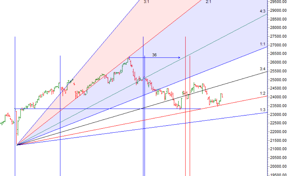 Price is in middle of 1×2 and 3×4 gann angle zone.