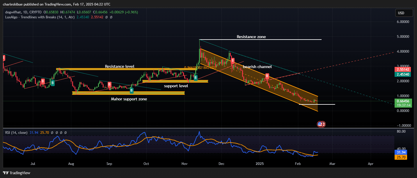 The Dogwifhat price remains under significant bearish pressure, and has been locked in a downward channel since mid-December.