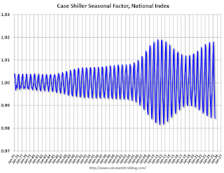 The second graph shows the seasonal factors for the Case-Shiller National index since 1987. The factors started to change near the peak of the bubble, and really increased during the bust since normal sales followed the regular seasonal pattern – and distressed sales happened all year.