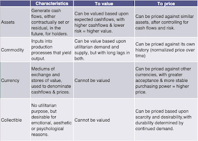 With assets, you can estimate value based on expected cash flows and risk. but you also price them based upon demand and supply. With commodities like oil or iron ore, you may be able to estimate value, based upon aggregated demand and supply, but it is far more likely that pricing will dominate. With currencies and collectibles, the absence of expected cash flows makes pricing the only option, making mood and momentumkey variables determining pricing direction.