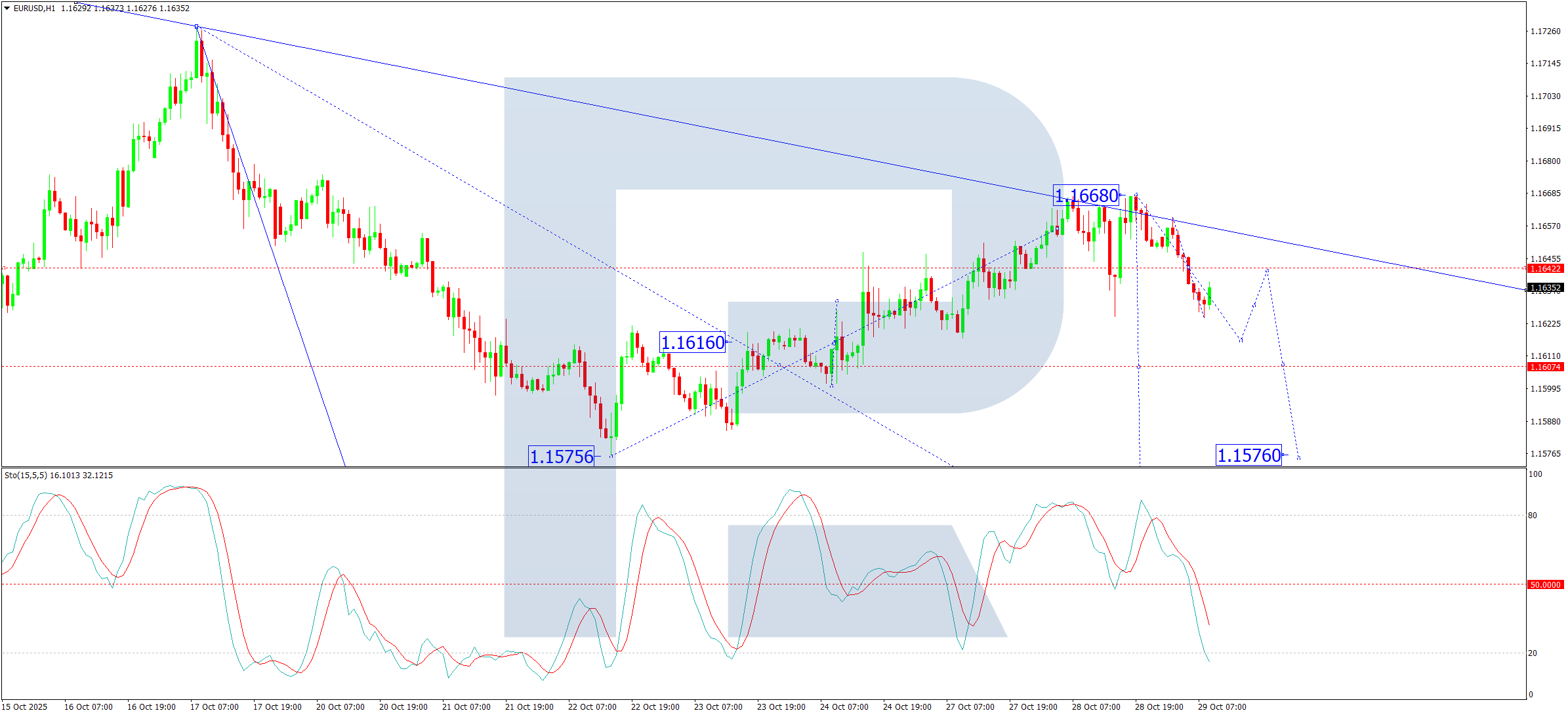On the H1 chart, the market is forming a downward wave structure targeting 1.1616. The pair is effectively establishing the boundaries of a new consolidation range around this level. An upward breakout could trigger another correction towards 1.1640. However, the primary expectation is for a resumption of the downtrend to 1.1576, with the potential to extend the wave to 1.1540. This would represent only the first half of the third wave within the broader downward trend. The Stochastic oscillator supports this outlook. Its signal line is below 50 and is falling confidently towards 20, suggesting that short-term downward potential remains.