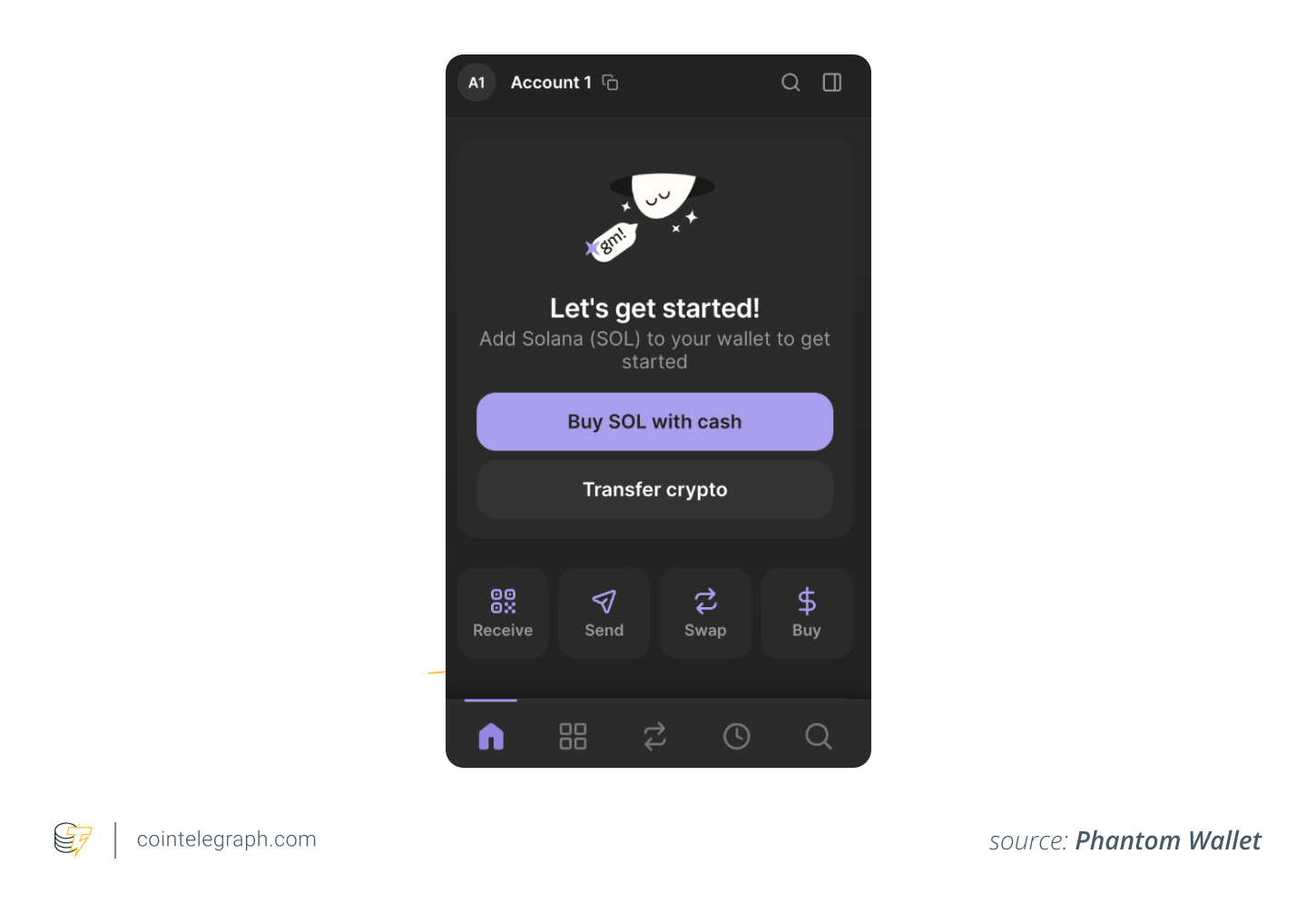 Fund Phantom with SOL by either transferring SOL from another wallet or buying it with a debit/credit card via the “Buy” button.