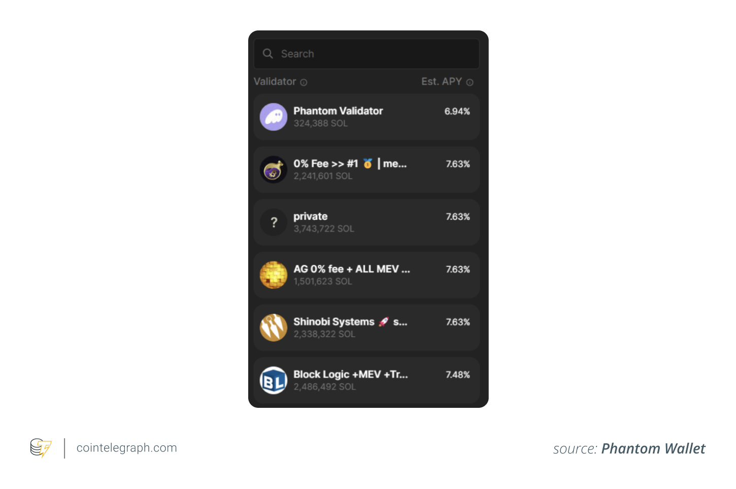 If you choose native staking, you must commit to a validator. Phantom will list validators in order of how much SOL is staked to them and their estimated APY.
