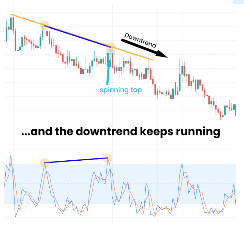 The pair is starting to produce lower highs, but the stochastic is showing higher highs. It is a hidden divergence. The pair is already in a downtrend as you can see, but the downtrend only continued after this hidden divergence showed up. In fact, the hidden divergence was pointing towards a continued downtrend for anyone who was paying close attention to it.