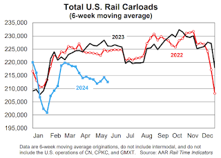 Total originated carloads on U.S. railroads in May 2024 were down 6.0%, or 67,145 carloads, from May 2023. The weekly average in May 2024 was 212,160 carloads, virtually the same as in April 2024.Year-to-date total carloads in 2024 through May were down 5.0% (247,984 carloads) from the same period last year and down 4.4% from the same period in 2022.