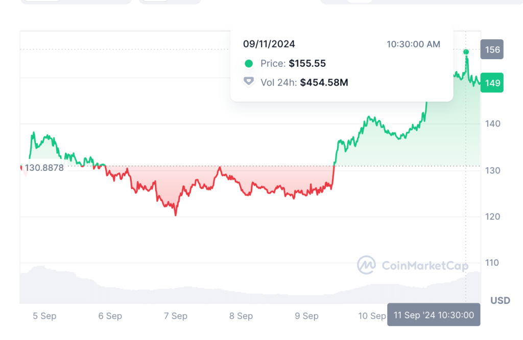 AAVE Price Chart for the Last Week, CoinMarketCap, September 11, 2024