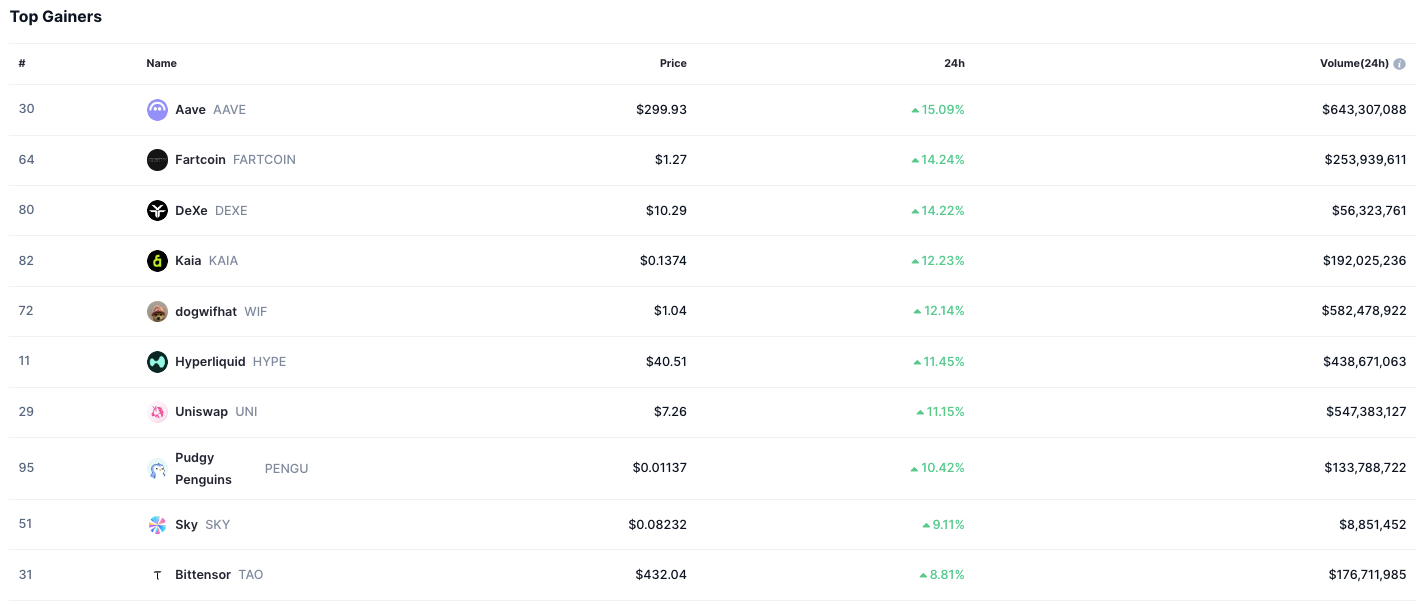 Aave led the cryptocurrency market in 24-hour gains, as several tokens across DeFi and meme sectors posted double-digit increases, backed by significant trading volumes. The surge in price movements indicates a high level of market participation, particularly in lending protocols, decentralized exchanges, and speculative meme assets.