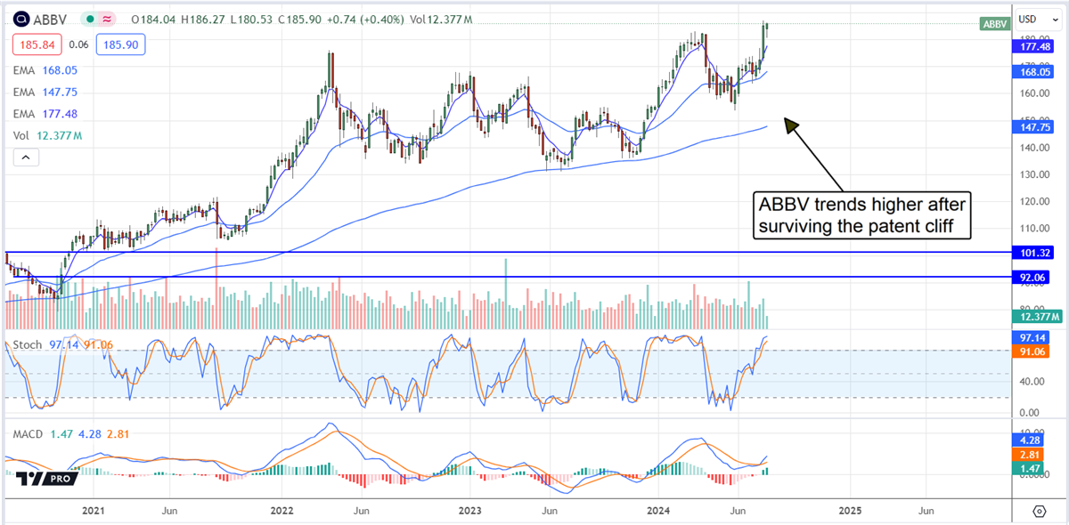 The price action following the release is bullish. The market rose 7.5% the week of the release and is now consolidating near the high, a fresh all-time high set with a bullish trend-following movement. Rising EMAs, bullish signals in the MACD, and stochastic indicators compound the action. They suggest upward momentum will continue to carry the market higher. Shares of ABBV could rise as much as $25 to $30 in this scenario and reach the $210 level by January 2025.