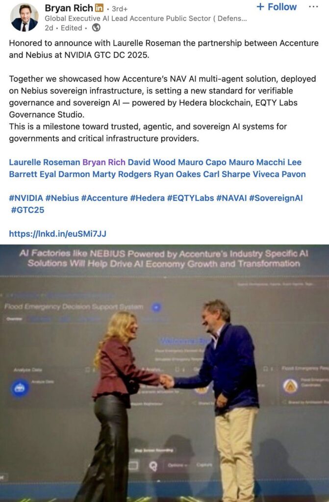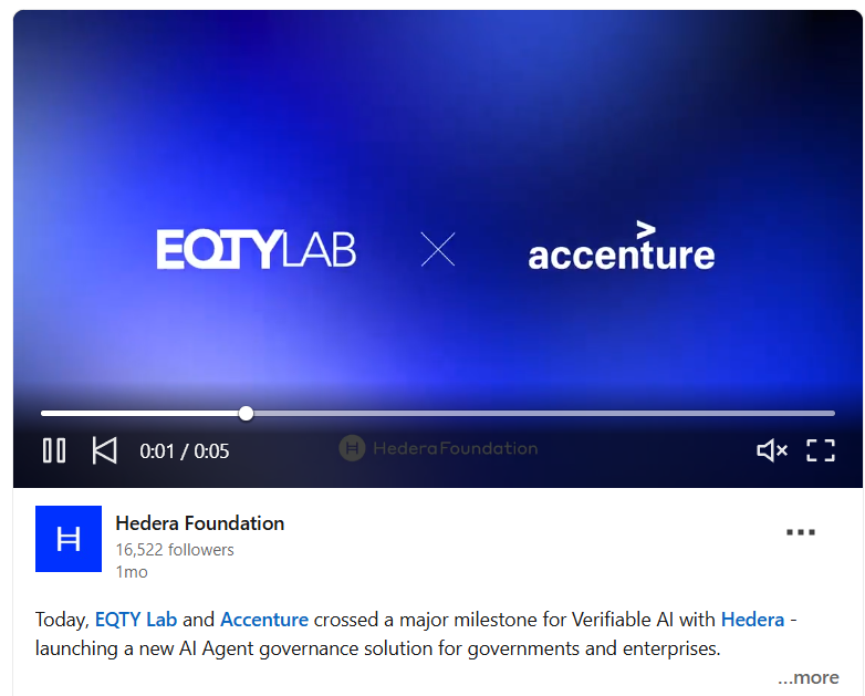 Accenture has also mentioned utilizing Hedera Hashgraph directly in relation to work being done with other AI leaders, including Nvidia.