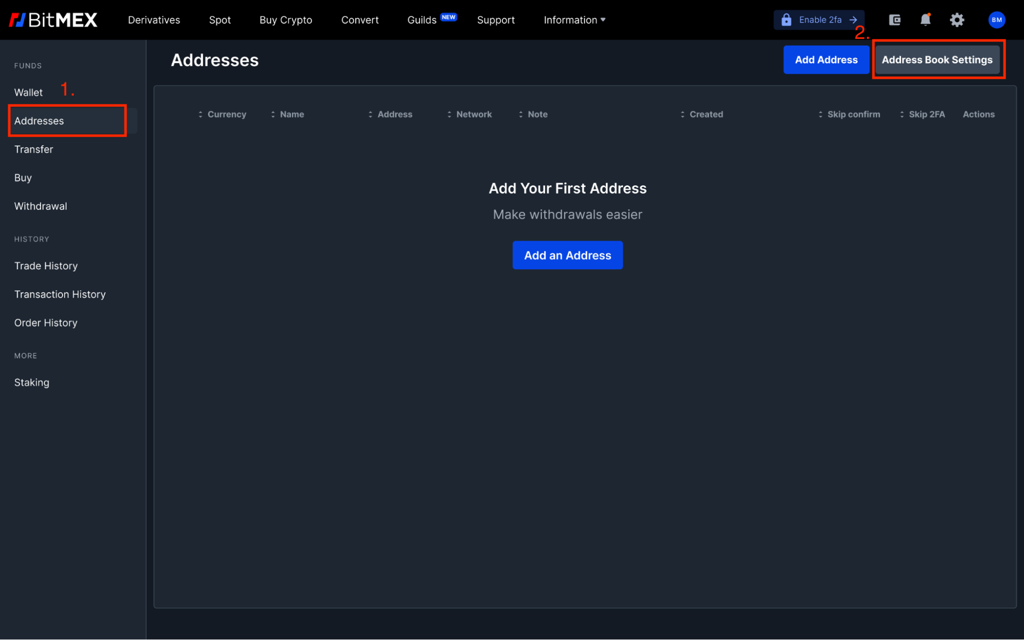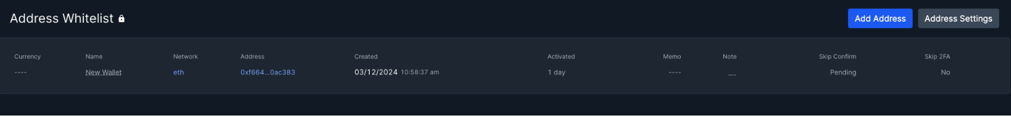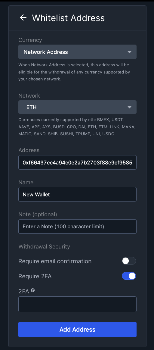 Once you update your address book settings, you will be able to add whitelist addresses for a network or currency of your choice, with the specific 2FA conditions that you set.