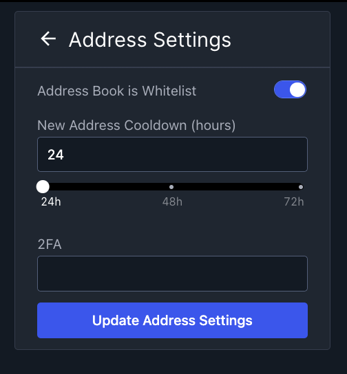 Another benefit of the address book whitelist feature is that users are now able to increase the security of their asset withdrawals through a cooldown period.