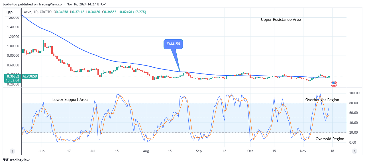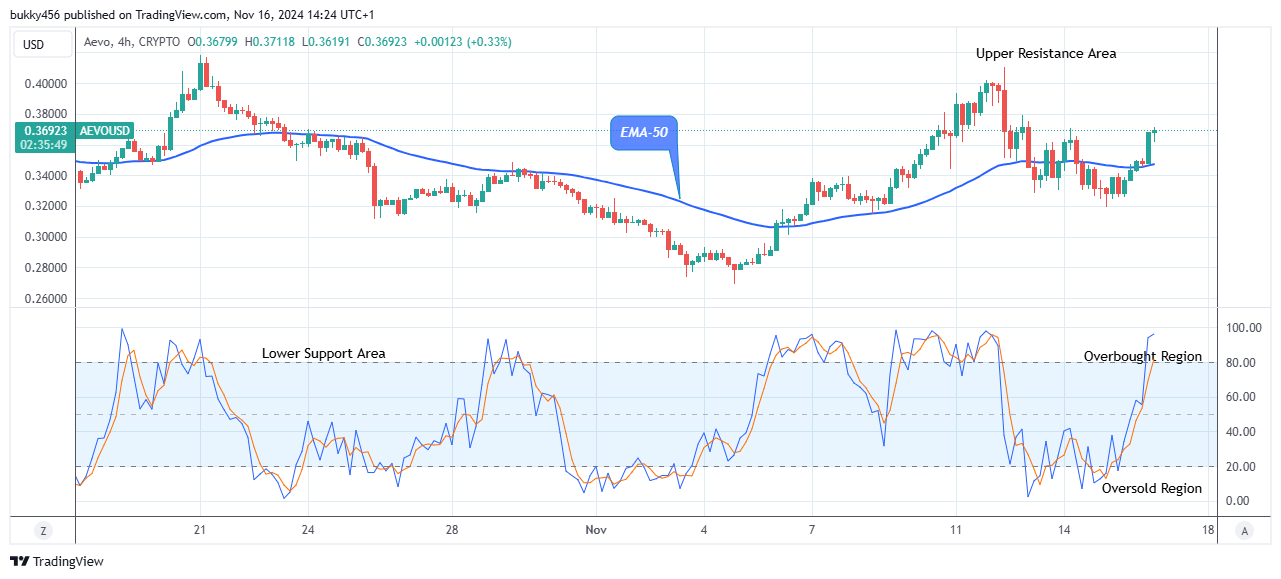 The AEVOUSD pair suggests the token price will keep rising as the bulls drove the crypto price to a $0.371 high mark above the EMA-50 as the daily chart opens today, resulting in intraday gains, prolonging the upward rally and fueling the release of more buy investors into the market as the Aevo price keep rising.