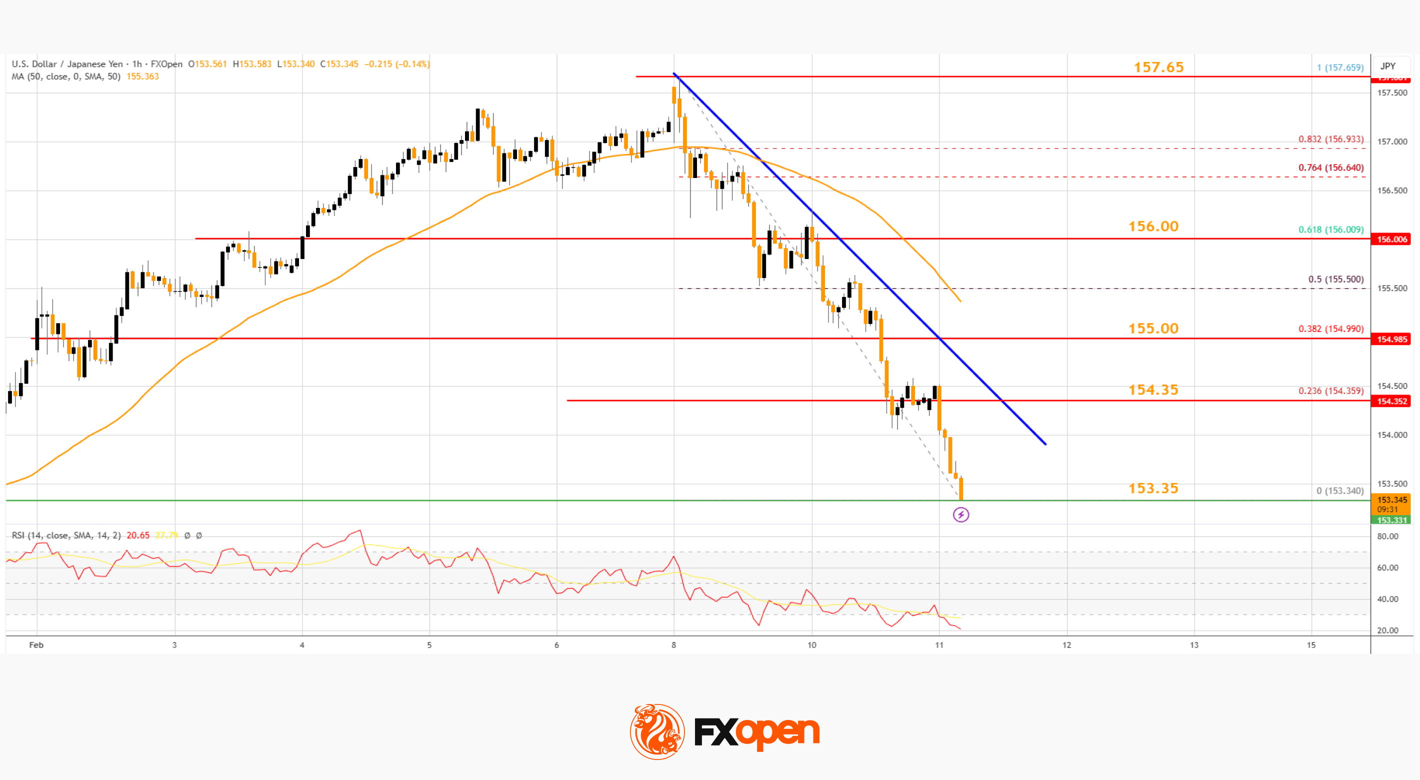 · There is a short-term bearish trend line forming with resistance at 154.65 on the hourly chart at FXOpen.