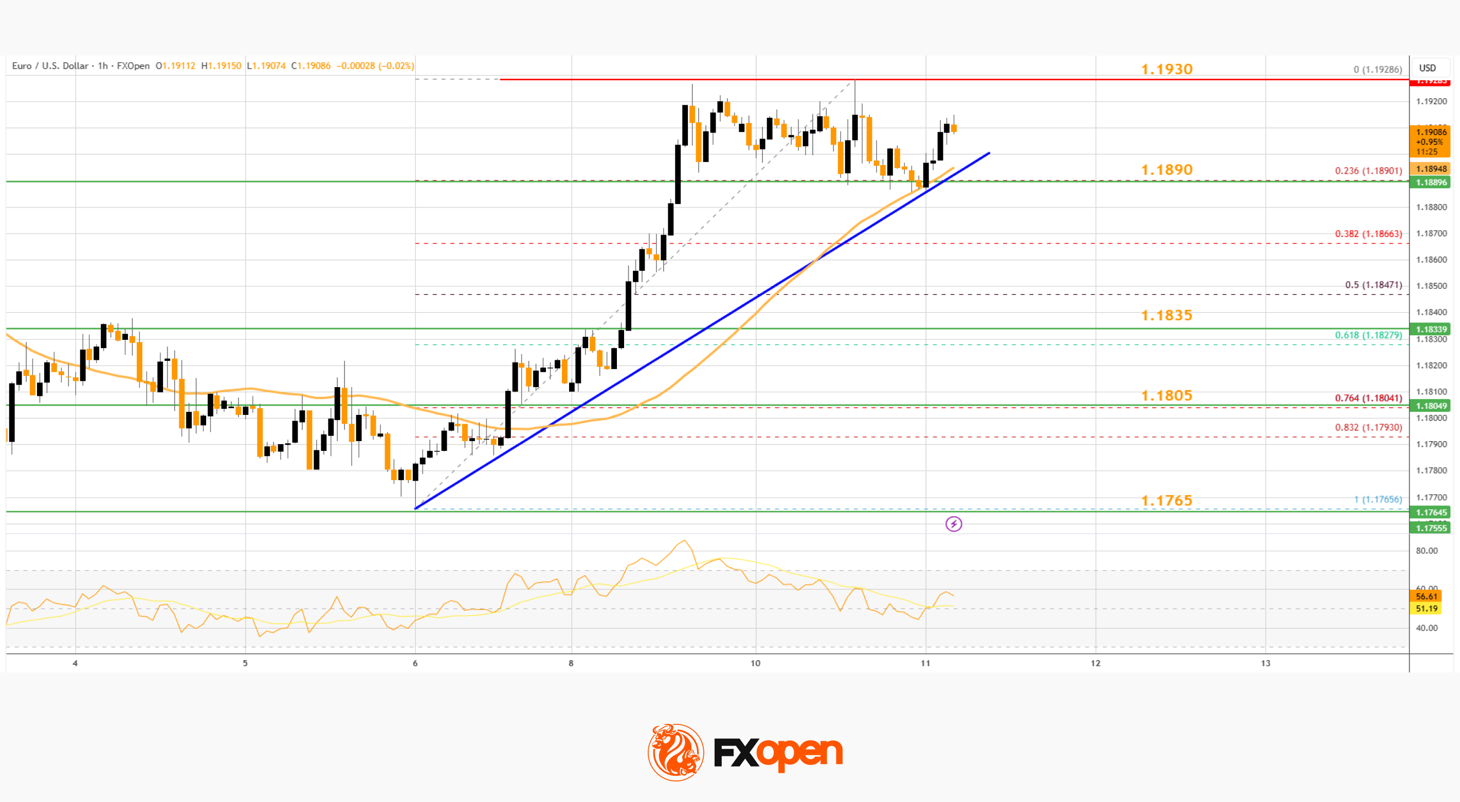 · There is a connecting bullish trend line forming with support at 1.1890 on the hourly chart of EUR/USD at FXOpen.