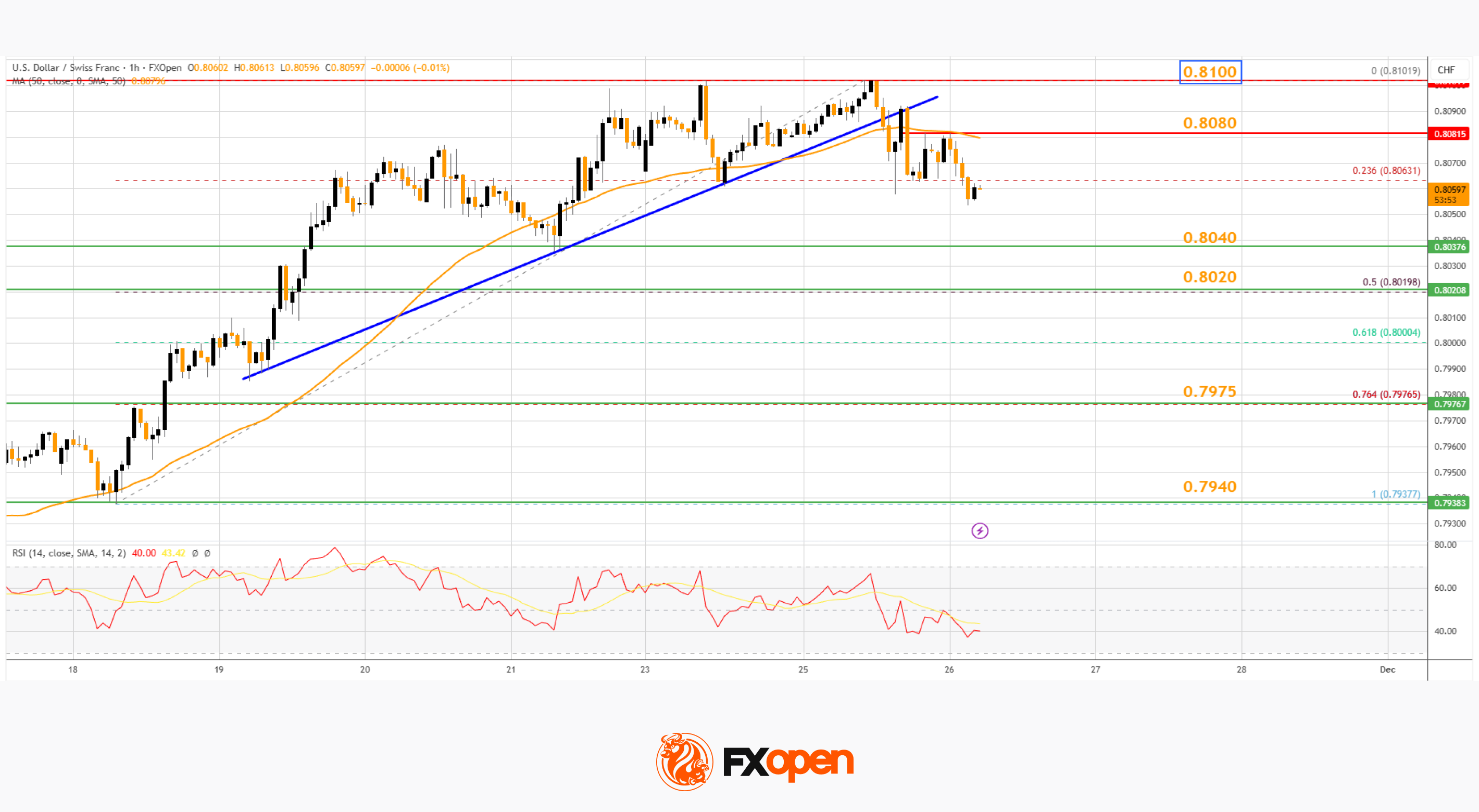 On the hourly chart of USD/CHF at FXOpen, the pair started a decent increase from 0.7940. The US Dollar climbed above the 0.8000 handle against the Swiss Franc.