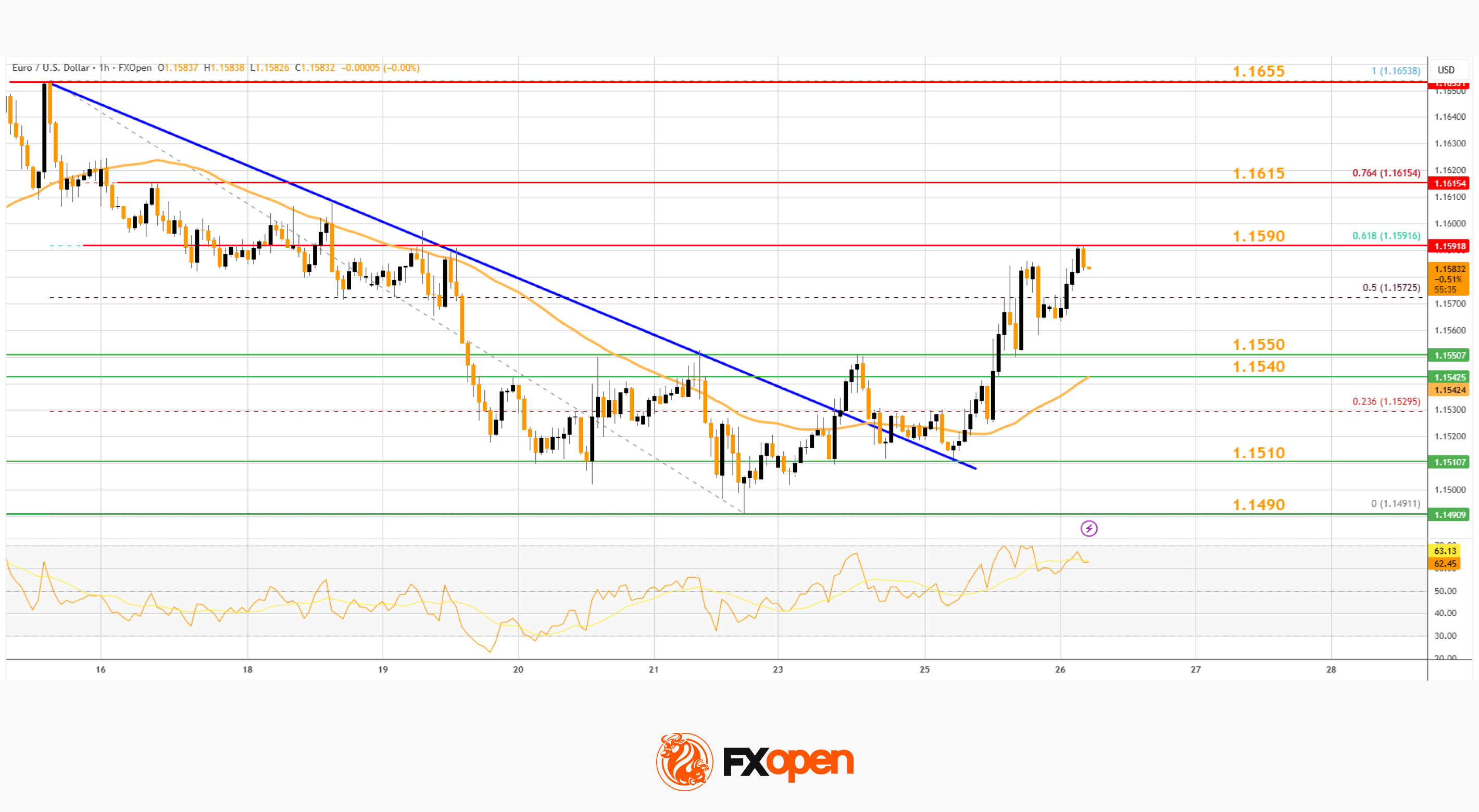 · There was a break above a major bearish trend line with resistance at 1.1530 on the hourly chart of EUR/USD at FXOpen.