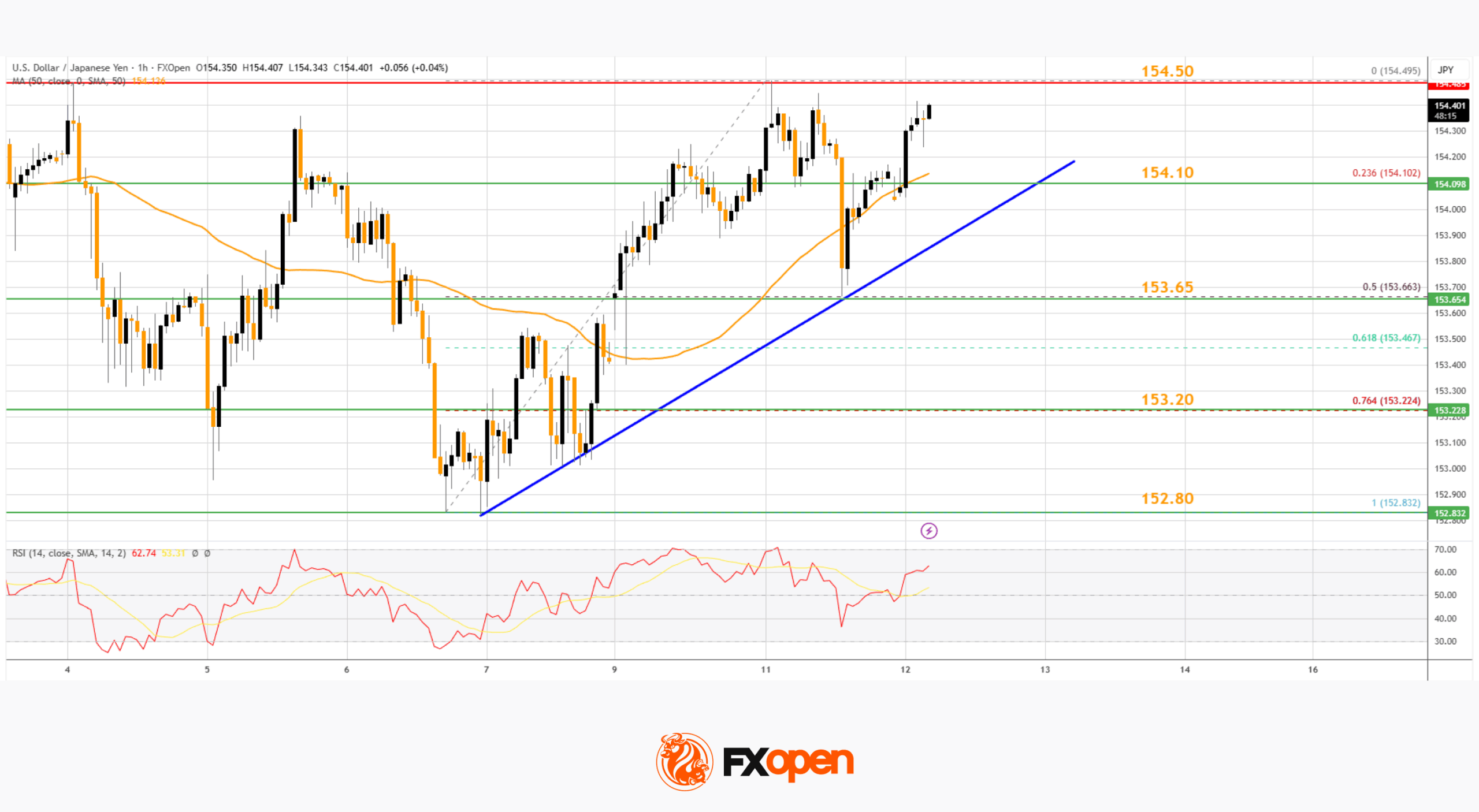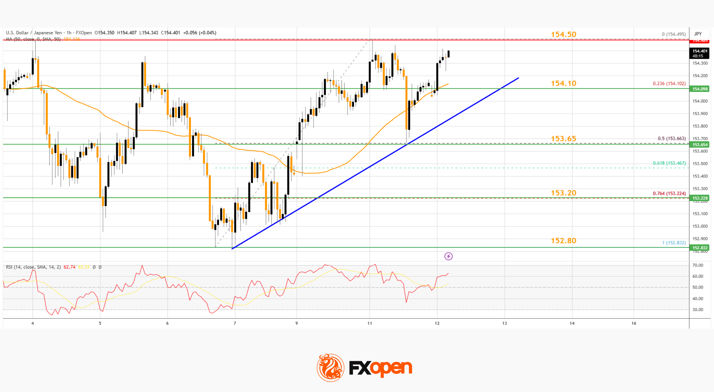 On the hourly chart of USD/JPY at FXOpen, the pair started a decent increase from 152.80. The US Dollar gained bullish momentum above 153.20 against the Japanese Yen.