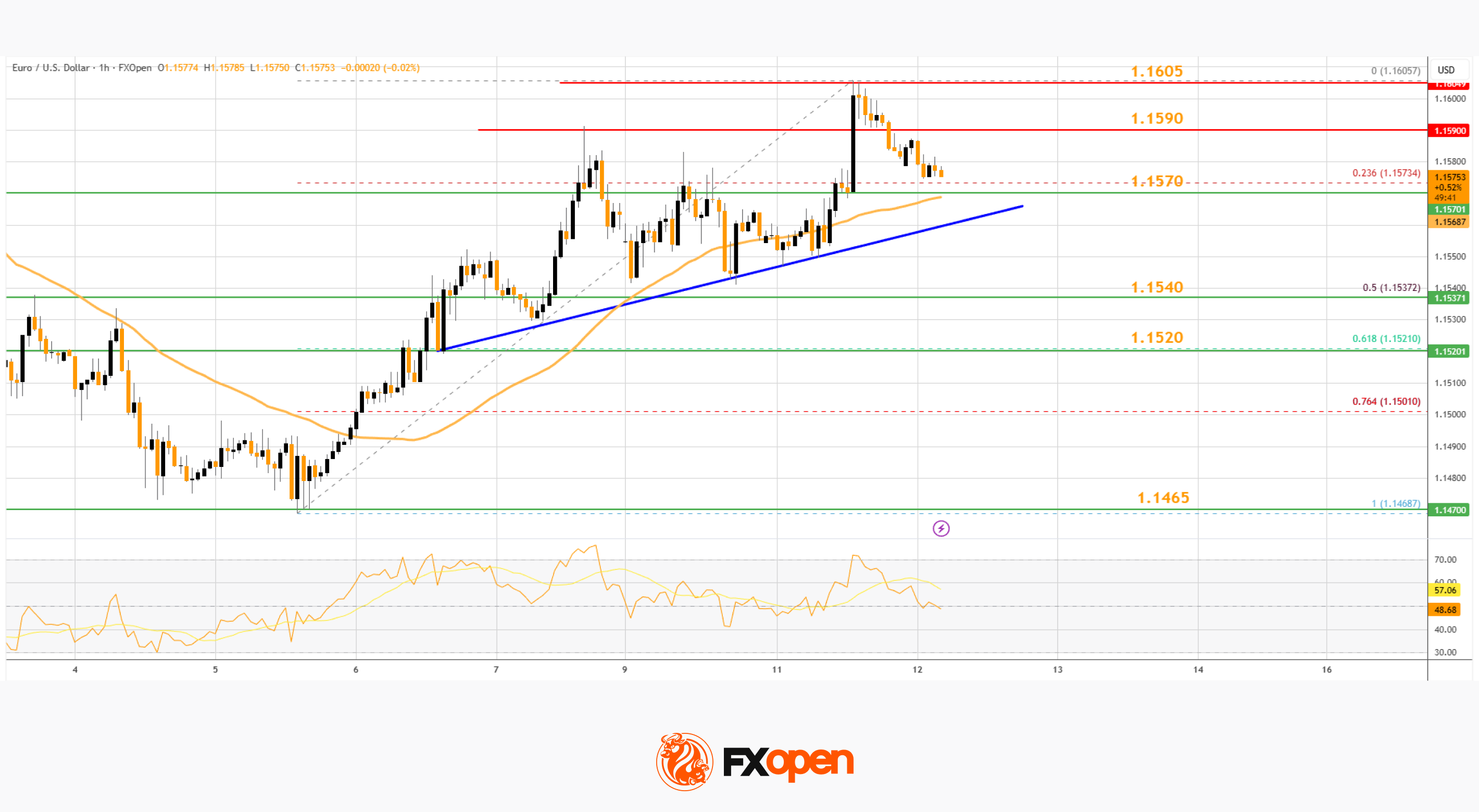 · There is a key bullish trend line forming with support near 1.1570 on the hourly chart of EUR/USD at FXOpen.