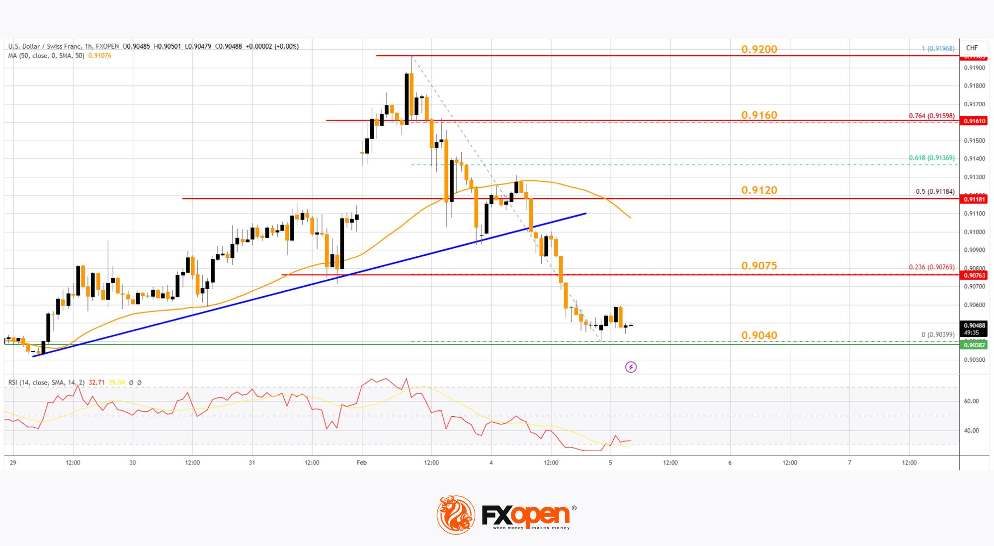 · There was a break below a major bullish trend line with support at 0.9100 on the hourly chart at FXOpen.