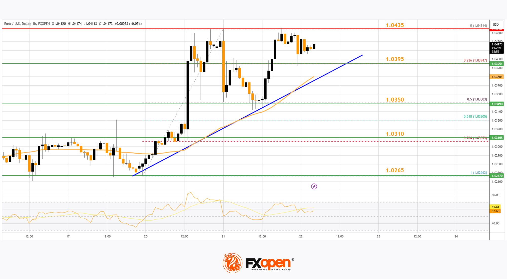 · There is a key bullish trend line forming with support near 1.0395 on the hourly chart of EUR/USD at FXOpen.