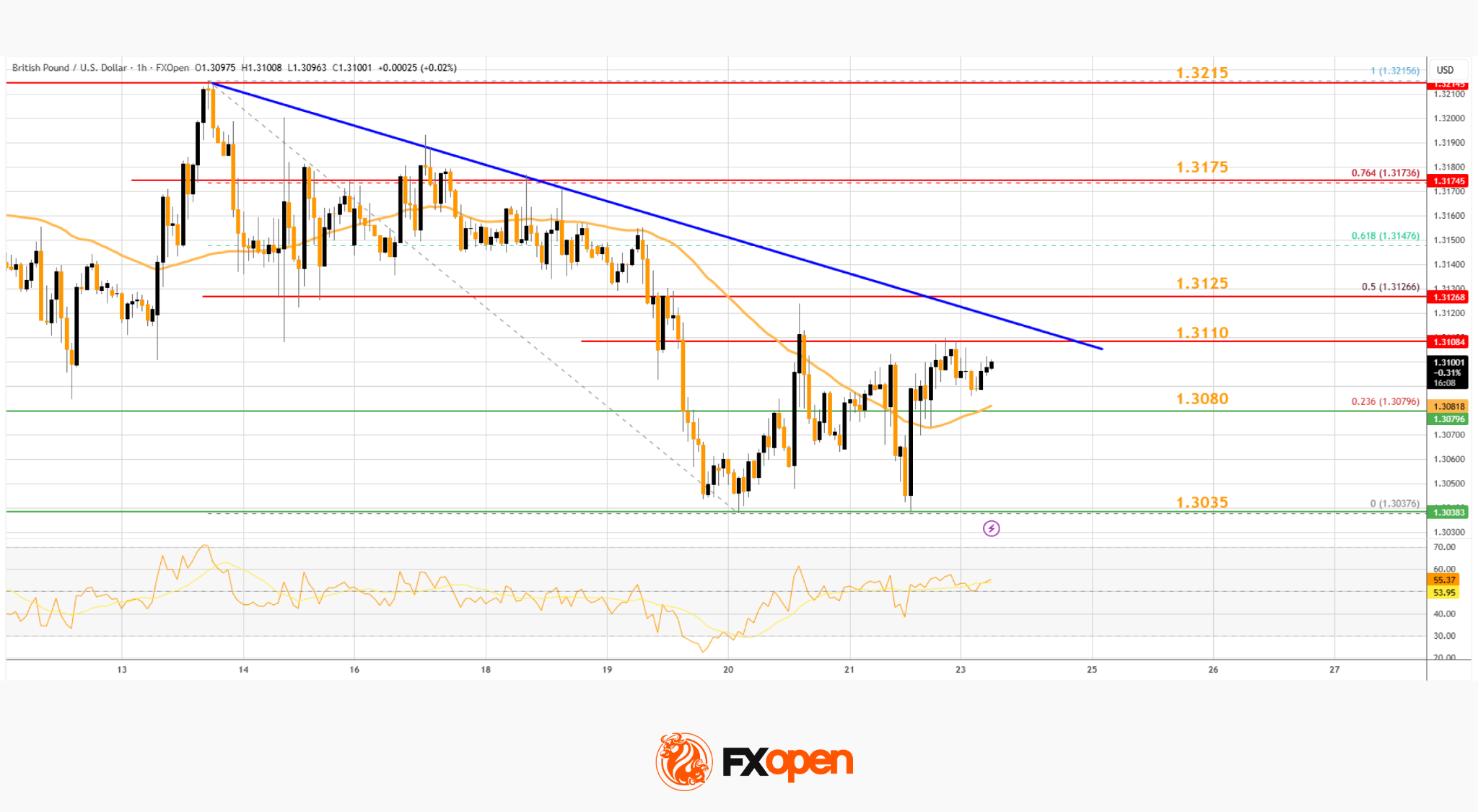 - There is a key bearish trend line forming with resistance near 1.3110 on the hourly chart of GBP/USD at FXOpen.