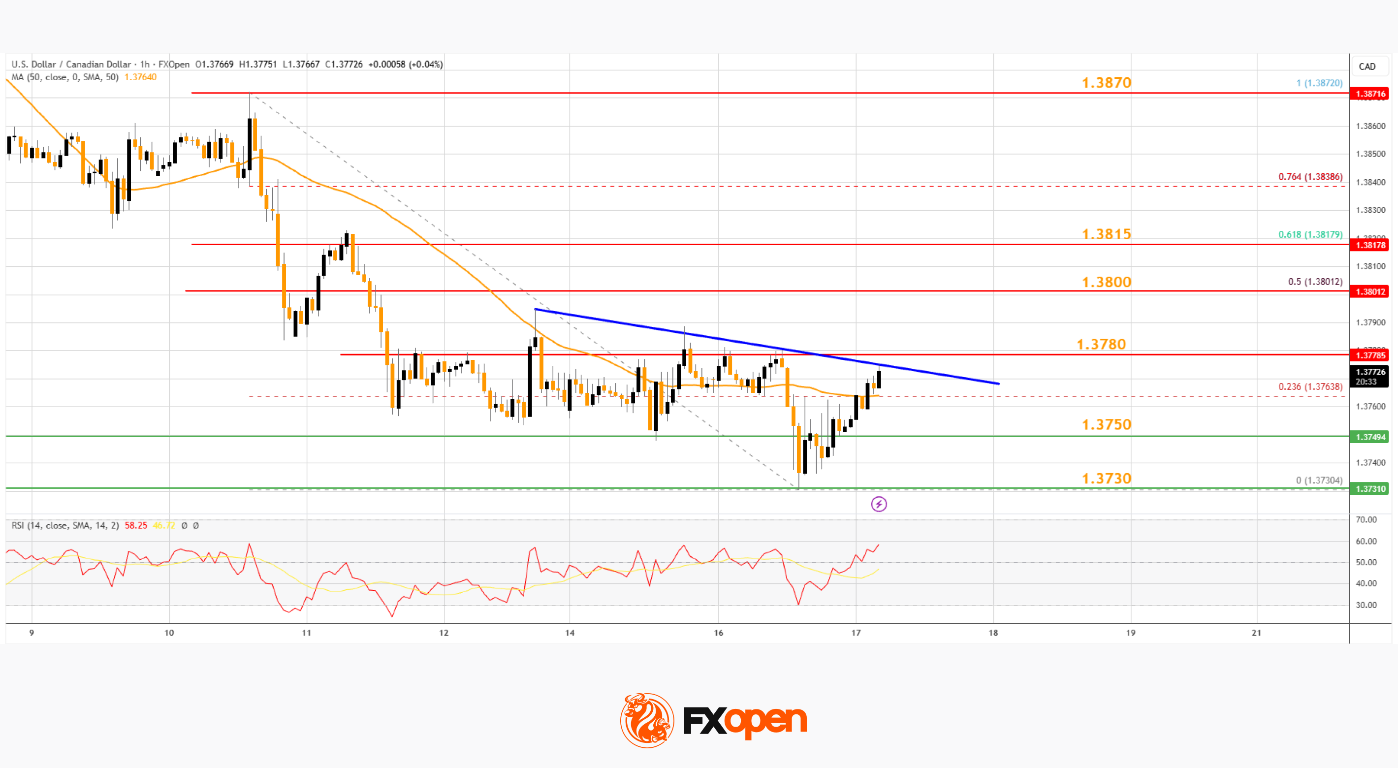 On the hourly chart of USD/CAD at FXOpen, the pair climbed toward 1.3880 before the bears appeared. The US Dollar formed a swing high near 1.3872 and recently declined below 1.3800 against the Canadian Dollar.