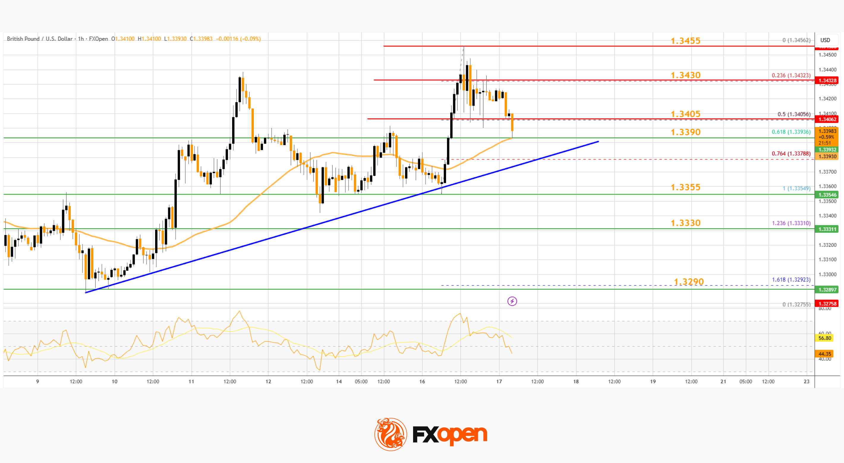 · There is a key bullish trend line forming with support at 1.3390 on the hourly chart of GBP/USD at FXOpen.