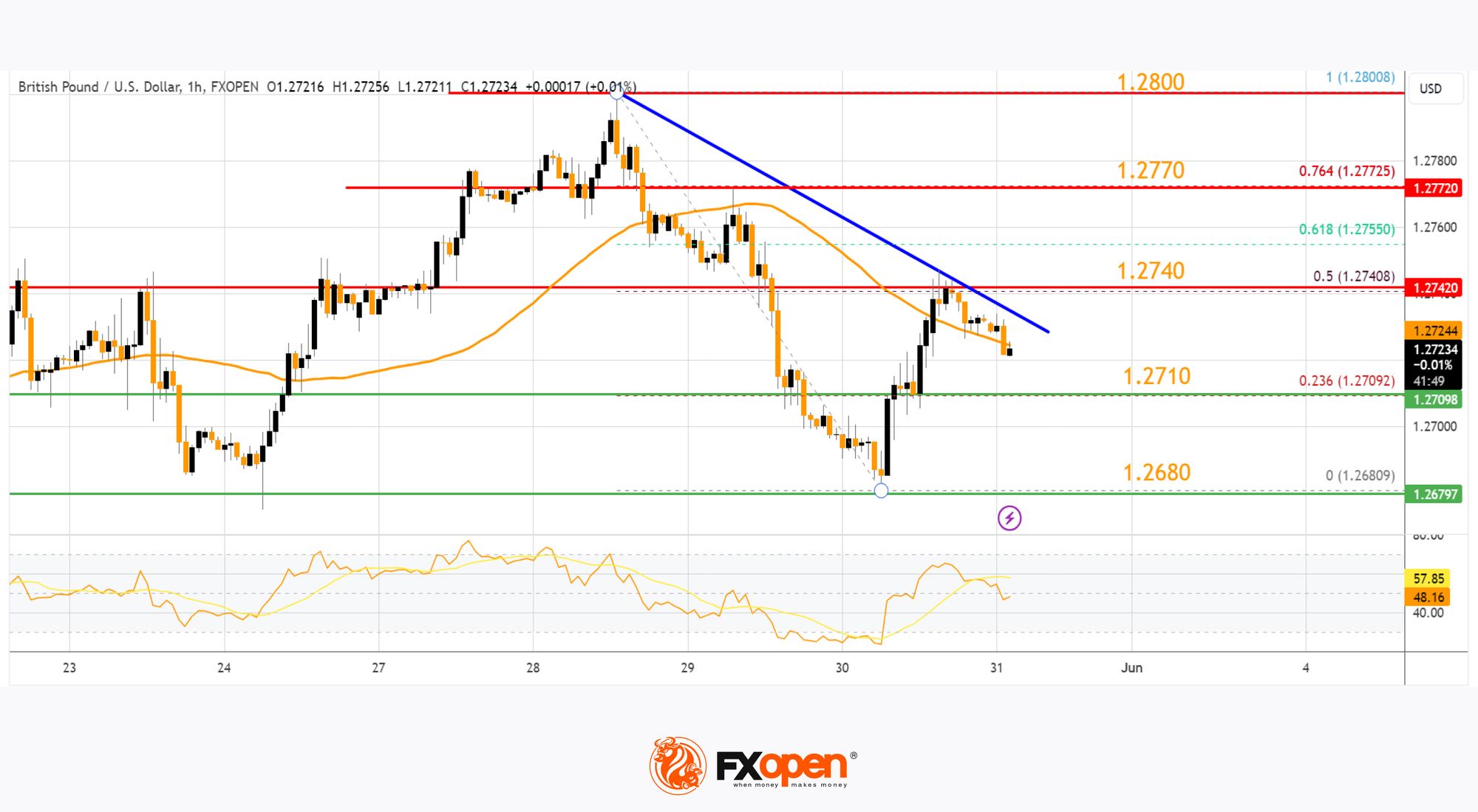 · There is a key bearish trend line forming with resistance near 1.2740 on the hourly chart of GBP/USD at FXOpen.