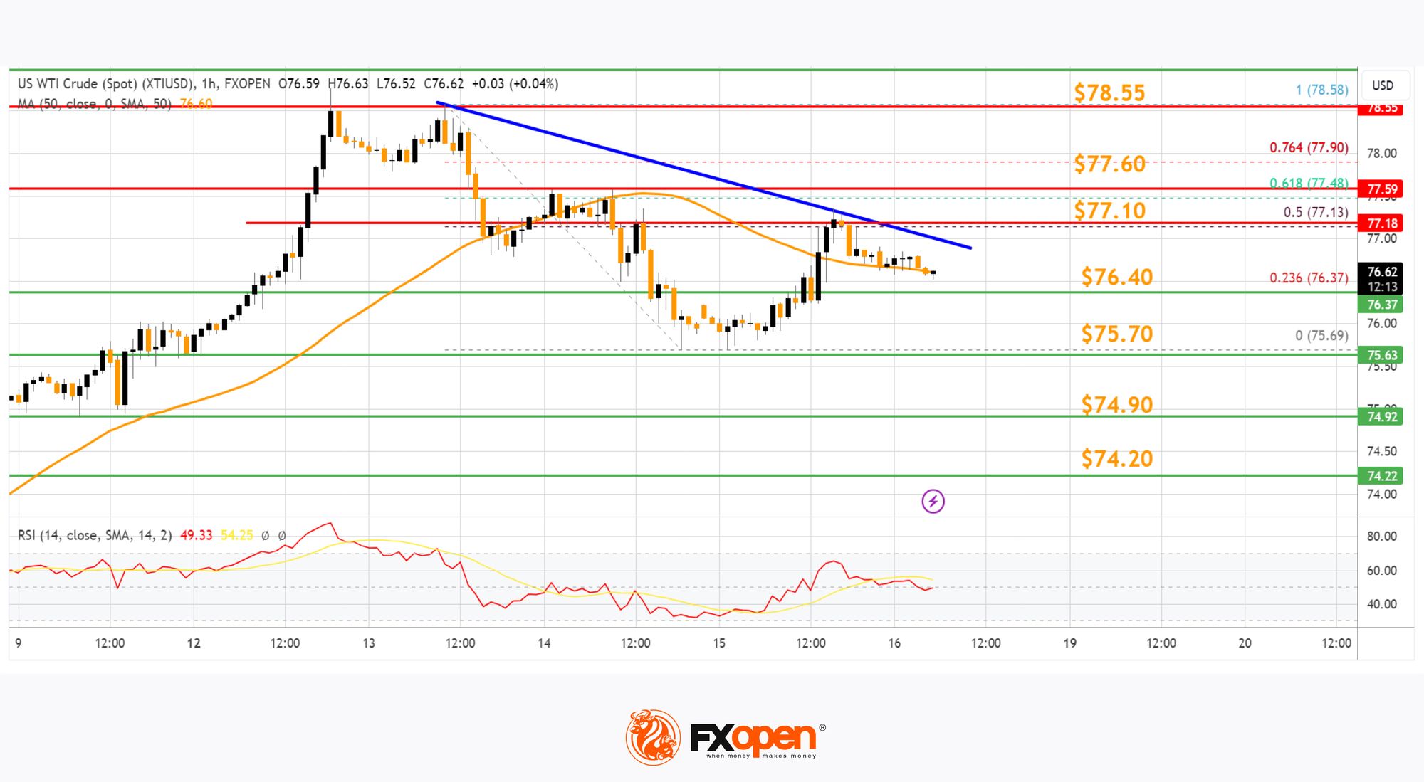 · There is a connecting bearish trend line forming with resistance at $77.10 on the hourly chart of XTI/USD at FXOpen.