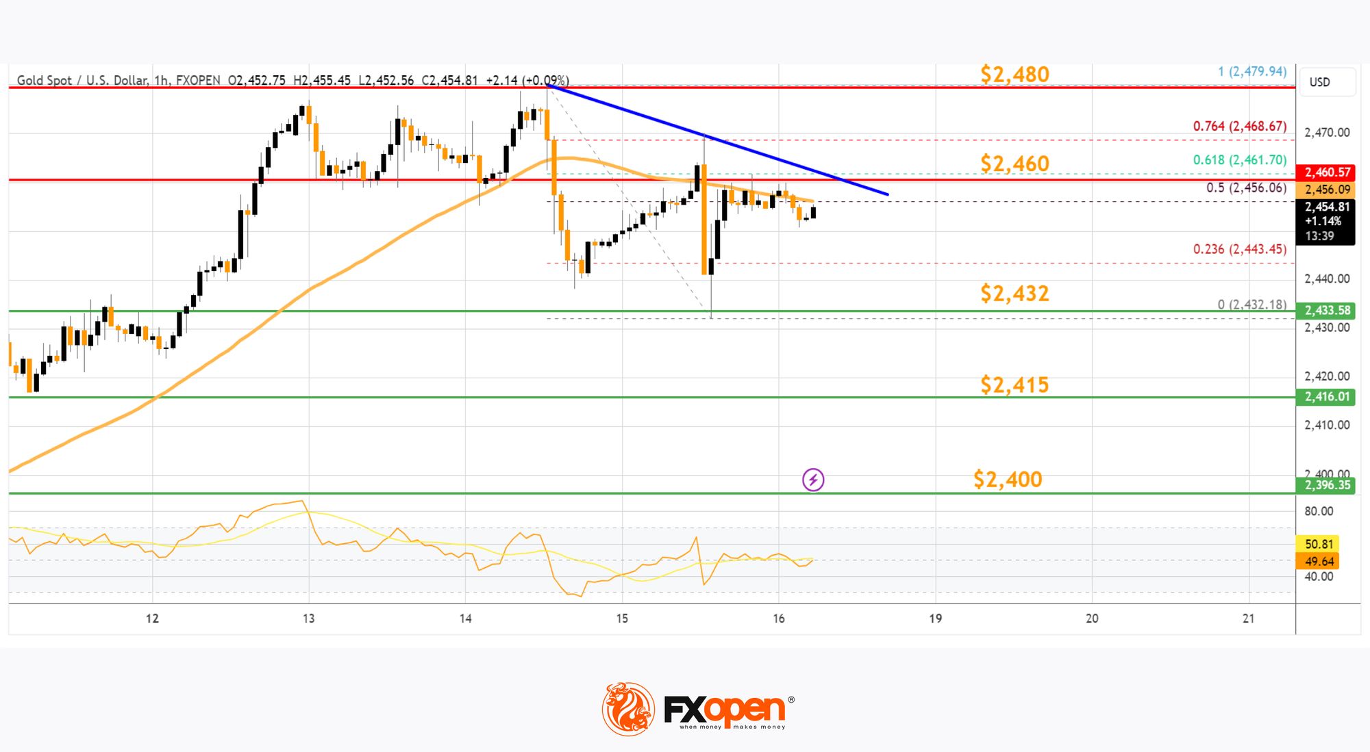 · A connecting bearish trend line is forming with resistance at $2,460 on the hourly chart of gold at FXOpen.