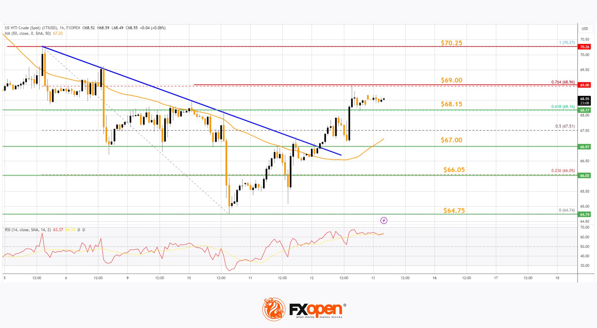· There was a break above a connecting bearish trend line with resistance near $67.00 on the hourly chart of XTI/USD at FXOpen.