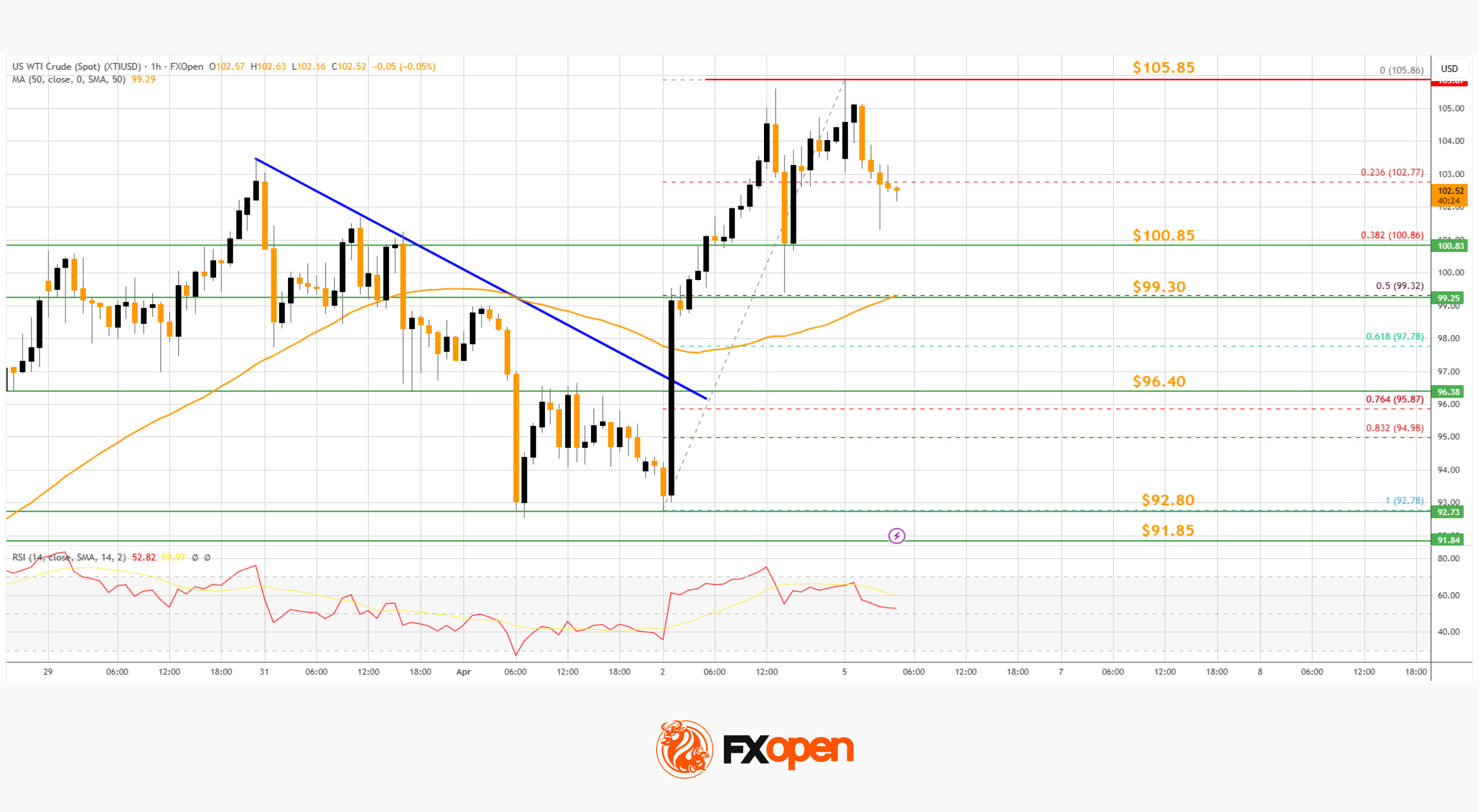 The bulls pushed the price above the 50-hour simple moving average, and the RSI climbed toward 75. Besides, there was a break above a bearish trend line with resistance at $97.00. The price tested the $105.85 zone and is currently consolidating gains.