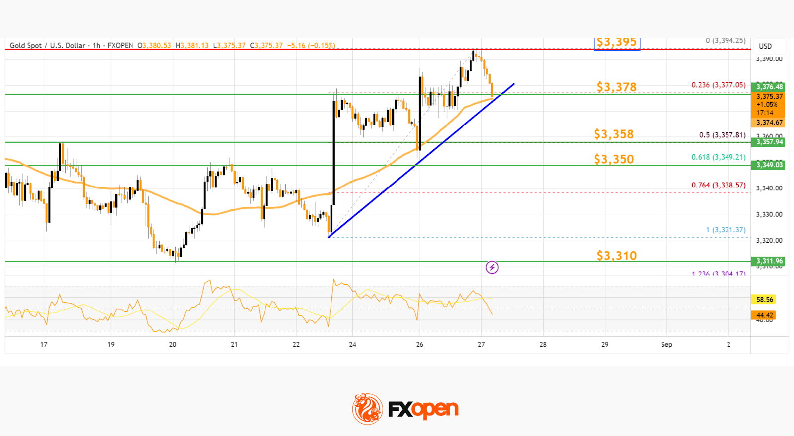 - A key bullish trend line is forming with support at $3,378 on the hourly chart of gold at FXOpen.