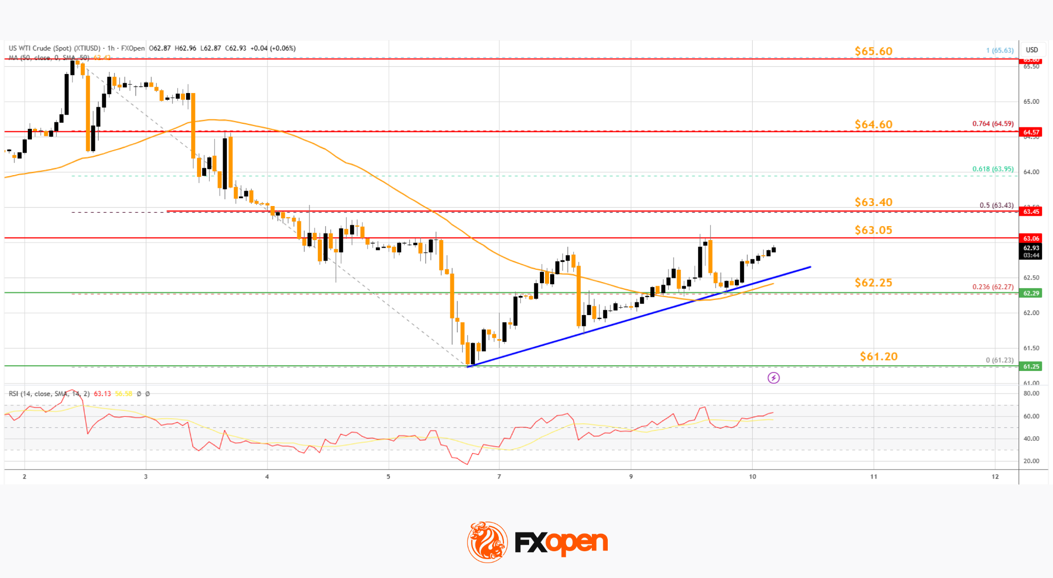 • There is a short-term bullish trend line forming with support at $62.25 on the hourly chart of XTI/USD at FXOpen.