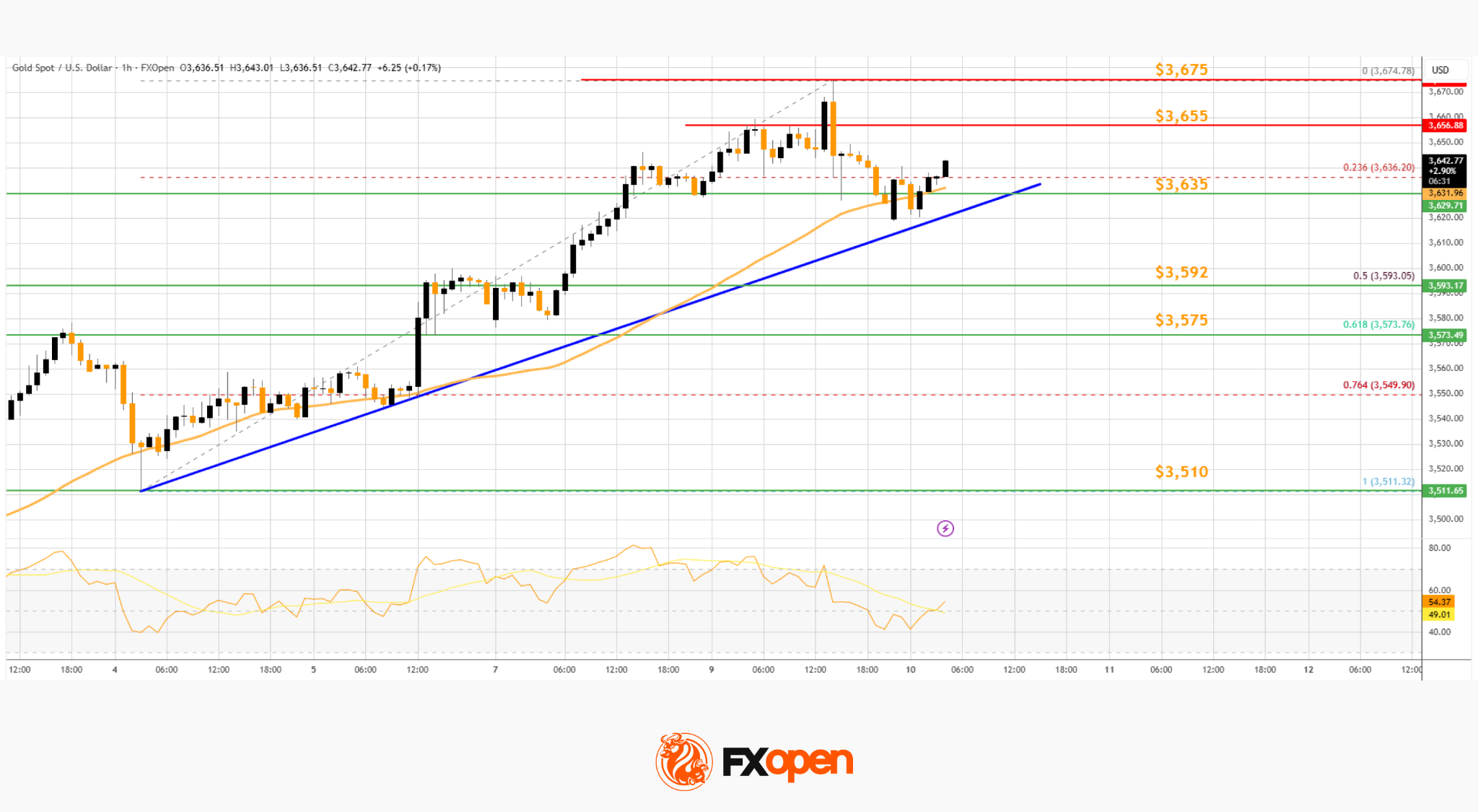 • A key bullish trend line is forming with support at $3,635 on the hourly chart of gold at FXOpen.