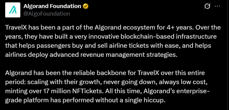 In response, the Algorand Foundation disclosed efforts to retain TravelX on-chain, including offering reduced fees, despite the network already being recognized for minimal fees.