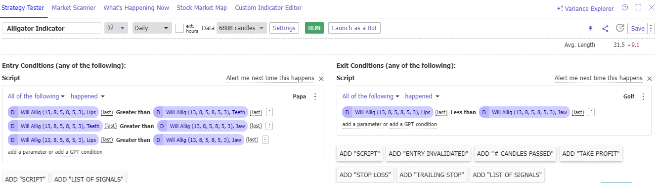 - Add Script: > Add Parameter > Condition > Indicator > Williams Alligator Lips > Less Than > Williams Alligator Jaw