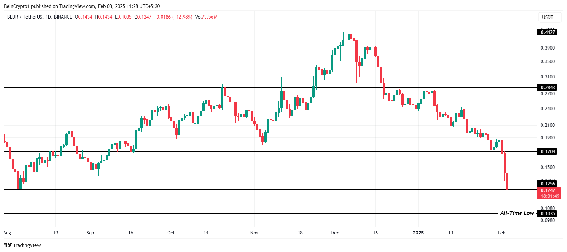 This all-time low marks the first since August 2024, highlighting the altcoin’s vulnerability. If BLUR continues its current trajectory, it could fall below the $0.100 threshold, further eroding investor confidence. Continued bearish pressure may extend the downtrend, leading to greater losses.