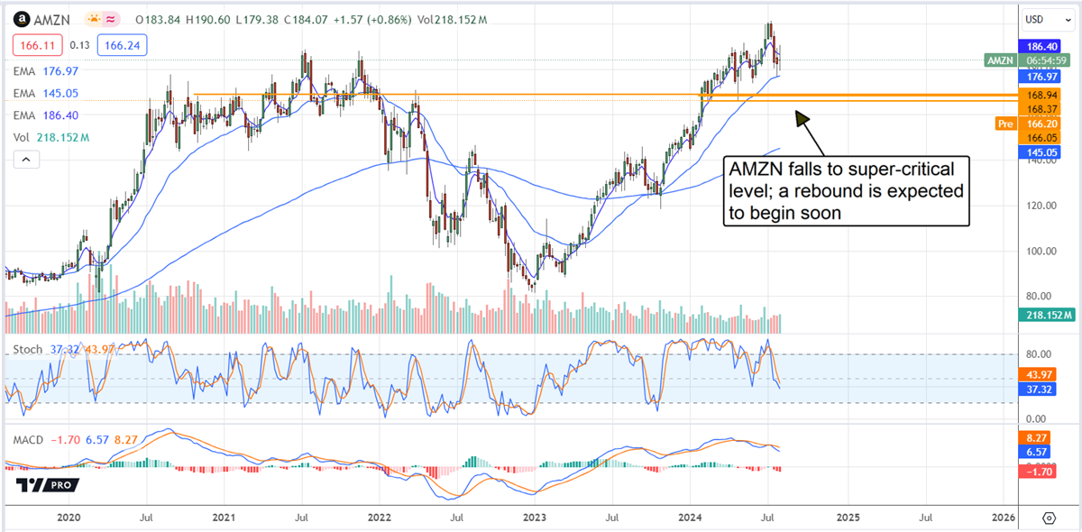 The price action in AMZN shares is bearish following the release, pushing the stock down to a super-critical support target. That target is near the $165-$170 range, a pivotal price point for the last four years. It capped gains in 2020, 2021, and 2022 and was a critical pivot point in 2023, later retested for support in 2024. Now, the market is back, retesting support at that level again, and it is likely to be confirmed. In that scenario, it is only a matter of time until new highs are set. If not, shares of AMZN could fall to $160 or lower before finding firm support.