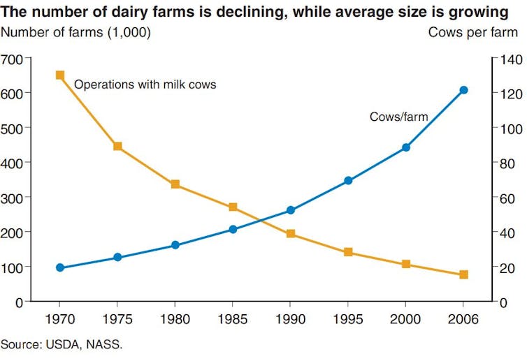 While the number of dairy farms has fallen, the average herd size – the number of cows per farm – has been rising. Today, more than 60% of all milk production occurs on farms with more than 2,500 cows.