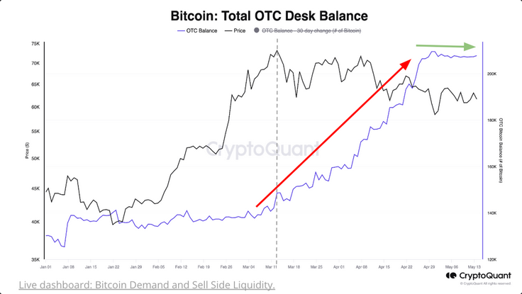 CryptoQuant analysts added that Bitcoin balances at over-the-counter (OTC) desks have stabilised since late April, indicating a reduced influx of Bitcoin supply into the market through these entities.
