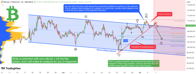 Анализ фокусируется на восходящем тренде цены Биткоина, в результате которого он достиг отметки в $110 000. Но он отмечает, что вместо полного прорыва цифровой актив не смог продолжить свой восходящий тренд даже после выхода из нисходящего канала. Учитывая это, Xanrox объясняет, что это ложный прорыв паттерна, или то, что обычно известно в криптосообществе как “ловушка для быков”.