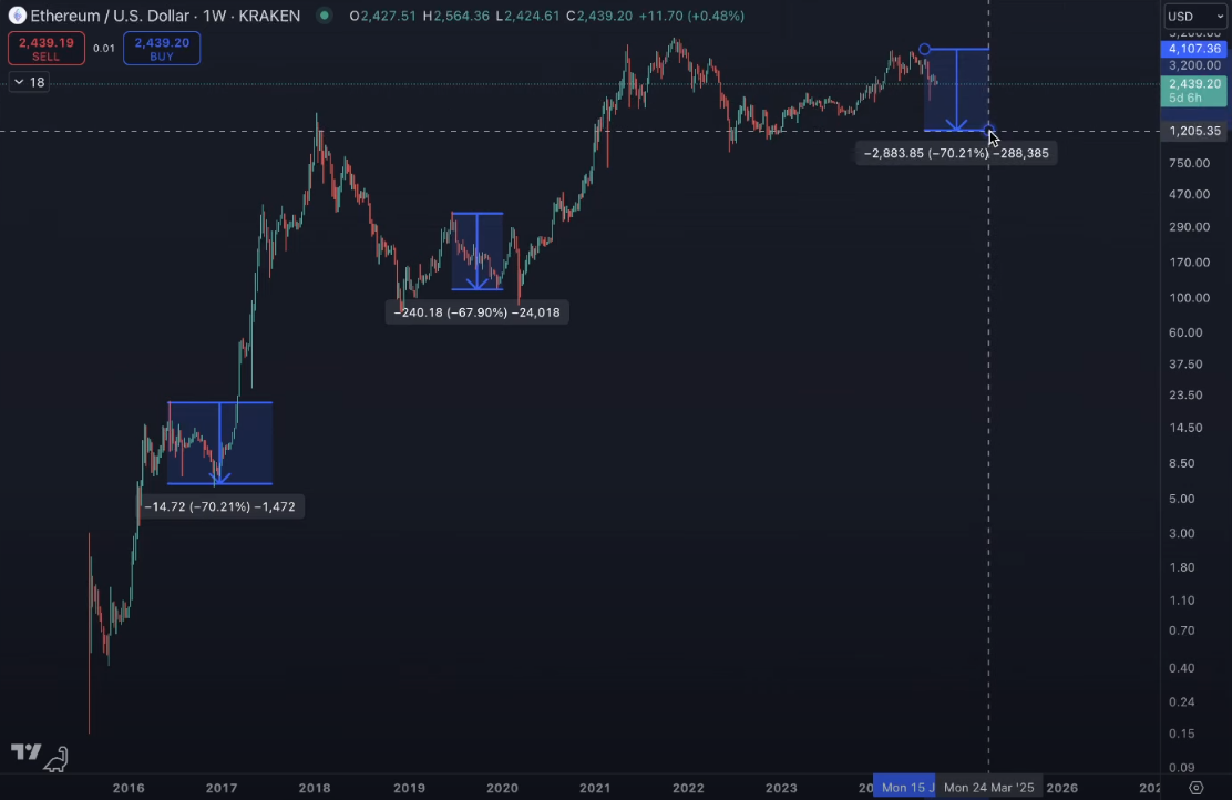 When it broke down here before the pandemic it was like 68%. And in 2016, it was 70%. So two 70% drops after Ethereum/Bitcoin broke down. And Ethereum/Bitcoin broke down in 2024. But 70% down would actually get you closer to $1,200.”