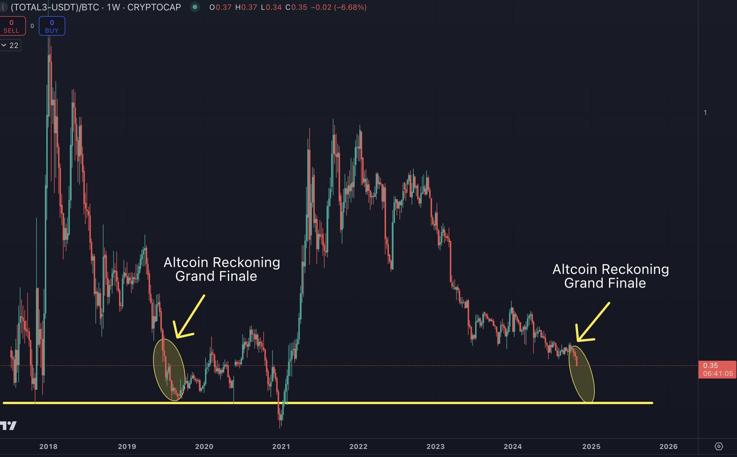 According to Cowen, TOTAL3/BTC appears to follow a price pattern witnessed in 2019 when the pair slumped to a key support level before a reversal and a strong uptrend.